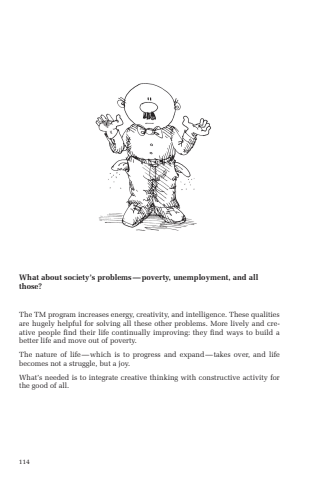114What about society%u2019s problems%u2014poverty, unemployment, and all those?The TM program increases energy, creativity, and intelligence. These qualities are hugely helpful for solving all these other problems. More lively and creative people find their life continually improving: they find ways to build a better life and move out of poverty. The nature of life%u2014which is to progress and expand%u2014takes over, and life becomes not a struggle, but a joy.What%u2019s needed is to integrate creative thinking with constructive activity for the good of all.