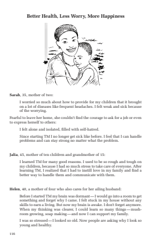 116Sarah, 35, mother of two:I worried so much about how to provide for my children that it brought on a lot of diseases like frequent headaches. I felt weak and sick because of the worrying.Fearful to leave her home, she couldn%u2019t find the courage to ask for a job or even to express herself to others: I felt alone and isolated, filled with self-hatred. Since starting TM I no longer get sick like before. I feel that I can handle problems and can stay strong no matter what the problem.Jalia, 45, mother of ten children and grandmother of 15:I learned TM for many good reasons. I used to be so rough and tough on my children, because I had so much stress to take care of everyone. After learning TM, I realized that I had to instill love in my family and find a better way to handle them and communicate with them.Helen, 40, a mother of four who also cares for her ailing husband:Before I started TM my brain was dormant%u2014I would go into a room to get something and forget why I came. I felt stuck in my house without any skills to earn a living. But now my brain is awake. I don%u2019t forget anymore. When my thinking was clearer, I could learn so many things%u2014mushroom growing, soap making%u2014and now I can support my family.I was so stressed%u2014I looked so old. Now people are asking why I look so young and healthy.Better Health, Less Worry, More Happiness