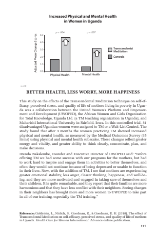 117Increased Physical and Mental Healthin Women in Uganda5.04.03.02.01.00.0Physical Health Mental HealthAdjusted Mean Change ScoresTranscendentalMeditationControlsp = .004 p = .007tm-038BETTER HEALTH, LESS WORRY, MORE HAPPINESSThis study on the effects of the Transcendental Meditation technique on self-effi cacy, perceived stress, and quality of life of mothers living in poverty in Uganda was a collaboration between the United Women%u2019s Platform and Empowerment and Development (UWOPED), the African Women and Girls Organization for Total Knowledge, Uganda Ltd. (a TM teaching organization in Uganda), and  Maharishi International University in Fairfi eld, Iowa. In this controlled trial, 81 disadvantaged Ugandan women were assigned to TM or a Wait-List Control. The study found that after 3 months the women practicing TM showed increased physical and mental health, as measured by the Medical Outcomes Survey (35 items) using physical and mental health subscales. These changes refl ect greater energy and vitality, and greater ability to think clearly, concentrate, plan, and make decisions.Brenda Nakalembe, Founder and Executive Director of UWOPED said: %u201cBefore offering TM we had some success with our programs for the mothers, but had to work hard to inspire and engage them in activities to better themselves, and often they would not continue because of being depressed or unable to function in their lives. Now, with the addition of TM, I see that mothers are experiencing greater emotional stability, less anger, clearer thinking, happiness, and well-being, and they are more motivated and engaged in taking care of themselves and their children. It is quite remarkable, and they report that their families are more harmonious and that they have less confl ict with their neighbors. Seeing changes in their neighbors has brought more and more women to UWOPED to take part in all of our training, especially the TM training.%u201d Reference: Goldstein, L., Nidich, S., Goodman, R., & Goodman, D. H. (2018). The effect of Transcendental Meditation on self-effi cacy, perceived stress, and quality of life of mothers in Uganda. Health Care for Women International. Advance online publication.
