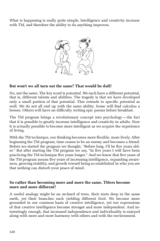 120But won%u2019t we all turn out the same? That would be dull!No, not the same. The key word is potential. We each have a different potential, that is, different talents and abilities. The tragedy is that we have developed only a small portion of that potential. This extends to specific potential as well. We do not all end up with the same ability. Some will find calculus a breeze. Others will have no difficulty writing epic poems before breakfast.The TM program brings a revolutionary concept into psychology%u2014the fact that it is possible to greatly increase intelligence and creativity in adults. Now it is actually possible to become more intelligent as we acquire the experience of living.With the TM technique, our thinking becomes more flexible, more lively. After beginning the TM program, time ceases to be an enemy and becomes a friend. Before we started the program we thought, %u201cBefore long, I%u2019ll be five years older.%u201d But after starting the TM program we say, %u201cIn five years I will have been practicing the TM technique five years longer.%u201d And we know that five years of the TM program means five years of increasing intelligence, expanding awareness, growing stability, and growth toward being so established in who you are that nothing can disturb your peace of mind.So rather than becoming more and more the same, TMers become more and more different?A useful analogy might be an orchard of trees, their roots deep in the same earth, yet their branches each yielding different fruit. We become more grounded in our common basis of creative intelligence, yet our expressions of that creative intelligence become stronger and more independent. And interestingly enough, that increased independence and individuality is enjoyed along with more and more harmony with others and with the environment.What is happening is really quite simple. Intelligence and creativity increase with TM, and therefore the ability to do anything improves.