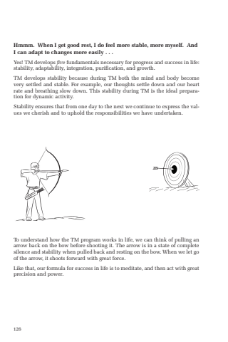 126Hmmm. When I get good rest, I do feel more stable, more myself. And I can adapt to changes more easily . . .Yes! TM develops five fundamentals necessary for progress and success in life: stability, adaptability, integration, purification, and growth.TM develops stability because during TM both the mind and body become very settled and stable. For example, our thoughts settle down and our heart rate and breathing slow down. This stability during TM is the ideal preparation for dynamic activity. Stability ensures that from one day to the next we continue to express the values we cherish and to uphold the responsibilities we have undertaken.To understand how the TM program works in life, we can think of pulling an arrow back on the bow before shooting it. The arrow is in a state of complete silence and stability when pulled back and resting on the bow. When we let go of the arrow, it shoots forward with great force. Like that, our formula for success in life is to meditate, and then act with great precision and power.