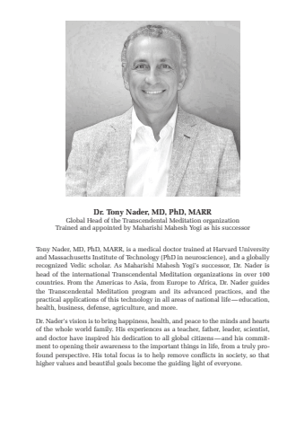 11Tony Nader, MD, PhD, MARR, is a medical doctor trained at Harvard University and Massachusetts Institute of Technology (PhD in neuroscience), and a globally recognized Vedic scholar. As Maharishi Mahesh Yogi%u2019s successor, Dr. Nader is head of the international Transcendental Meditation organizations in over 100 countries. From the Americas to Asia, from Europe to Africa, Dr. Nader guides the Transcendental Meditation program and its advanced practices, and the practical applications of this technology in all areas of national life%u2014education, health, business, defense, agriculture, and more.Dr. Nader%u2019s vision is to bring happiness, health, and peace to the minds and hearts of the whole world family. His experiences as a teacher, father, leader, scientist, and doctor have inspired his dedication to all global citizens%u2014and his commitment to opening their awareness to the important things in life, from a truly profound perspective. His total focus is to help remove conflicts in society, so that higher values and beautiful goals become the guiding light of everyone.Dr. Tony Nader, MD, PhD, MARRGlobal Head of the Transcendental Meditation organizationTrained and appointed by Maharishi Mahesh Yogi as his successor