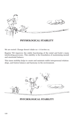 128PHYSIOLOGICAL STABILITYPSYCHOLOGICAL STABILITYWe are rooted. Change doesn%u2019t shake us%u2014it invites us. Regular TM improves the stable functioning of the mind and body%u2019s many interlocking processes. This stability is the foundation of maintaining mental and emotional balance.This inner stability helps to create and maintain stable interpersonal relationships, and fosters balance and harmony in the environment.