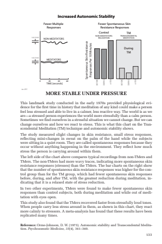 133This landmark study conducted in the early 1970s provided physiological evidence for the fi rst time in history that meditation of any kind could make a person feel less stressed and able to live in a calmer, less reactive way. The world is as we are %u2014 a stressed person experiences the world more stressfully than a calm person. Sometimes we fi nd ourselves in a stressful situation we cannot change. But we can change ourselves and how we react to stress. This is what this chart on the Transcendental Meditation (TM) technique and autonomic stability shows. The study measured slight changes in skin resistance, small stress responses, refl ecting mini-changes in sweat on the palm of the hand while the subjects were sitting in a quiet room. They are called spontaneous responses because they occur without anything happening in the environment. They refl ect how much stress the person is carrying around within them. The left side of the chart above compares typical recordings from non-TMers and TMers. The non-TMers had more wavy traces, indicating more spontaneous skin resistance responses (stresses) than the TMers. The bar charts on the right show that the number of spontaneous skin resistance responses was higher for the control group than for the TM group, which had fewer spontaneous skin responses before, during, and after TM, with the greatest reduction during meditation, indicating that it is a relaxed state of stress reduction.In two other experiments, TMers were found to make fewer spontaneous skin responses than control subjects, both during meditation and while out of meditation with eyes open. This study also found that the TMers recovered faster from stressfully loud tones. When people carry less stress around in them, as shown in this chart, they react more calmly to stressors. A meta-analysis has found that these results have been replicated many times.Increased Autonomic StabilityControl TMFewer Spontaneous SkinResistance ResponsesSpontaneous Skin ResistanceResponses Per 10 MinutesFewer MultipleResponses100 OHMS100 OHMSNON-MEDITATORSMEDITATORSTIME [seconds]0 20 40 60NON-MEDITATORS:RELAXATIONTRANSCENDENTALMEDITATIONDuringTMBEFORE DURING AFTER BEFORE DURING AFTERtm-091MORE STABLE UNDER PRESSUREReference: Orme-Johnson, D. W. (1973). Autonomic stability and Transcendental Meditation. Psychosomatic Medicine, 35(4), 341%u2013349.