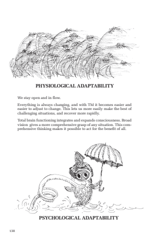 138PHYSIOLOGICAL ADAPTABILITYPSYCHOLOGICAL ADAPTABILITYWe stay open and in flow. Everything is always changing, and with TM it becomes easier and easier to adjust to change. This lets us more easily make the best of challenging situations, and recover more rapidly. Total brain functioning integrates and expands consciousness. Broad vision gives a more comprehensive grasp of any situation. This comprehensive thinking makes it possible to act for the benefit of all.