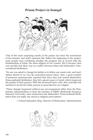 160%u201cOne of the most surprising results of the project has been the enrichment of the inmates%u2019 and staff%u2019s spiritual life. Before the beginning of the project, some people were wondering whether the program was in accord with the fundamentals of Islam, the main religion of our country. But it became clear very quickly that there was no conflict between Islam and Maharishi%u2019s Transcendental Meditation.%u201cNo one was asked to change his beliefs or to follow any moral code, and meditation altered in no way the prescribed prayer times. Also, a good number of prisoners spontaneously reported that since they had started Maharishi%u2019s Transcendental Meditation, they felt a greater peace of mind, which improved the quality of their prayers. With this increased inner calm, they naturally felt inclined to do the five daily prayers as prescribed by our religion. %u201cThese changes happened without any encouragement either from the Penitentiary Administration or from the teachers of MERU [Maharishi European Research University], since instruction into Maharishi%u2019s Transcendental Meditation does not imply any moral or religious prescription.%u201d %u2014Colonel Mamadou Diop, Director of Penitentiary AdministrationPrison Project in Senegal