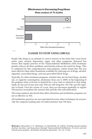 165People take drugs in an attempt to correct stresses in the body that cause headaches, pain, anxiety, depression, anger, and other symptoms. Research has shown that regular practice of the Transcendental Meditation (TM) technique greatly reduces all these problems and thereby reduces the need for drugs. This is confi rmed by this comprehensive meta-analysis, which found that TM was more effective than other treatments available for reducing use of drugs, alcohol, cigarettes, prescribed drugs, and non-prescribed illicit drugs. Typically, for other treatment programs, whether they are for hard drugs, alcohol use, or cigarette consumption, abstinence from use is 100% at the beginning of the program when everyone is inspired for a new start or required to stop using. Sadly, by the end of one year only 10% are still drug-free. For TM, just the opposite is found. Over the course of a year, drug use decreases gradually as regular TM practice normalizes the stresses that provoke this self-medication. This meta-analysis also found that other relaxation and meditation programs are not as effective as TM. All meditation practices are not equivalent because other techniques do not provide the uniquely healing state of restful alertness that TM does. Efiect Size (Standard Deviations)0PeerInffuencePreventiveEducation0.2 0.4 0.6 0.8 1.0TMEfiectiveness in Decreasing Drug AbuseMeta-analysis of 70 studiesp = .000004tm-047EASIER TO STOP USING DRUGSReference: Alexander, C. N., Robinson, P., & Rainforth, M. (1994). Treating and preventing alcohol, nicotine, and drug abuse through Transcendental Meditation: A review and statistical meta-analysis. Alcoholism Treatment Quarterly, 11(1%u20132), 13%u201388.