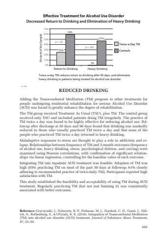 169Efiective Treatment for Alcohol Use DisorderDecreased Return to Drinking and Elimination of Heavy Drinking 25%0%59%47%70%60%50%40%30%20%10%0%Return to Drinking Heavy DrinkingPercent of the SampleTwice-a-Day TMControlsp = .02p = .001Twice-a-day TM reduces return to drinking after 90 days, and eliminates heavy drinking in patients being treated for alcohol use disorder.tm-048REDUCED DRINKINGAdding the Transcendental Meditation (TM) program to other treatments for people undergoing residential rehabilitation for serious Alcohol Use Disorder (AUD) was found to greatly enhance the degree of rehabilitation. The TM group received Treatment As Usual (TAU), plus TM. The control group received only TAU and included patients doing TM irregularly. The practice of TM twice a day was found to be highly effective for reducing alcohol use. Followup after discharge at 30 days and 90 days found that drinking was markedly reduced in those who usually practiced TM twice a day and that none of the people who practiced TM twice a day returned to heavy drinking.Maladaptive responses to stress are thought to play a role in addiction and relapse. Relationships between frequency of TM and 3-month outcomes (frequency of alcohol use, heavy drinking, stress, psychological distress, and craving) were examined using Pearson correlations, with confi rmation of signifi cant relationships via linear regression, controlling for the baseline value of each outcome.Integrating TM into inpatient AUD treatment was feasible. Adoption of TM was high (85% practicing TM on most of the past 30 days at followup; 61% closely adhering to recommended practice of twice-daily TM). Participants reported high satisfaction with TM. This study established the feasibility and acceptability of using TM during AUD treatment. Regularly practicing TM (but not just learning it) was consistently associated with better outcomes. Reference: Gryczynski, J., Schwartz, R. P., Fishman, M. J., Nordeck, C. D., Grant, J., Nidich, S., Rothenberg, S., & O%u2019Grady, K. E. (2018). Integration of Transcendental Meditation (TM) into alcohol use disorder (AUD) treatment. Journal of Substance Abuse Treatment, 87, 23%u201330.
