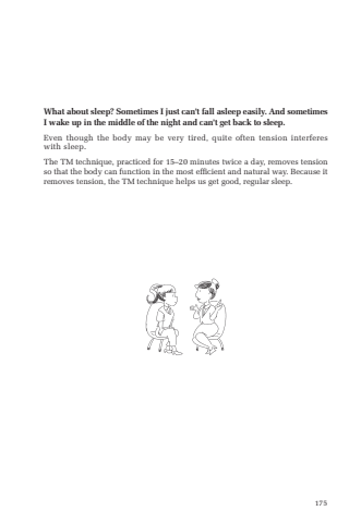 175What about sleep? Sometimes I just can%u2019t fall asleep easily. And sometimes I wake up in the middle of the night and can%u2019t get back to sleep.Even though the body may be very tired, quite often tension interferes with sleep. The TM technique, practiced for 15%u201320 minutes twice a day, removes tension so that the body can function in the most efficient and natural way. Because it removes tension, the TM technique helps us get good, regular sleep.
