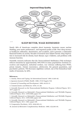 177Nearly 30% of Americans complain about insomnia. Insomnia causes unclear thinking, poor motor performance, and impaired quality of life. Poor sleep increases healthcare utilization, absenteeism, and accidents, and it presents a substantial fi nancial burden on society. Decades of research have linked chronic sleep deprivation to increased risk for obesity, heart disease, type 2 diabetes, and problems with immune function.Scientifi c research indicates that the Transcendental Meditation (TM) technique reduces insomnia by approximately 30%%u201365% in many populations: business executives and employees, industrial workers, war veterans suffering from PTSD, prison inmates, chronic insomniacs, adolescents, the general population, and psychiatric patients. TM decreases nighttime cortisol, one of the biomedical hallmarks of insomnia, by 40%.TMTechniquePrison InmatesGeneralPopulationUSAPsychiatric PatientsGeneralPopulationItalyWar Vets withPTSDChronic InsomniacsAdolescentsDecreased Cortisol at NightExecutives & EmployeesIndustrialWorkersp = .0025p = .05p = .01p = .0001p = .001p = .05p = .02p = .05p = .001p = .01Improved Sleep Qualitytm-025SLEEP BETTER, WAKE REFRESHEDReferences:1. Anxiety, Stress and Coping: An International Journal. 1993; 6:245%u201362.2. Japanese Journal of Public Health. 1990; 37(10 Suppl.):729.3. Journal of Counseling and Development. 1985; 64:212%u20135.4. Criminal Justice and Behavior. 1978; 5:3%u201320.5. Scientifi c Research on the Transcendental Meditation Program: Collected Papers, Vol 1. 1977; paper 41.6. Scientifi c Research on Maharishi%u2019s Transcendental Meditation and TM-Sidhi Program: Collected Papers, Vol 2. 1978/1989; paper 153.7. Scientifi c Research on Maharishi%u2019s Transcendental Meditation and TM-Sidhi Program: Collected Papers, Vol 2. 1976/1989; paper 126.8. Scientifi c Research on Maharishi%u2019s Transcendental Meditation and TM-Sidhi Program: Collected Papers, Vol 3. 1981; paper 239. 9. Comparative Psychiatry. 1975; 16(4):303%u201321.10. Journal of Alternative Complementary Medicine. 1995; 1(3):263%u201383.