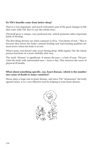 178So TM%u2019s benefits come from better sleep?That is a very important, and much welcomed, part of the good changes in life that come with TM. But it%u2019s not the whole story.TM itself gives a unique, very profound rest, which promotes other important kinds of healing.The first thing doctors say when someone is ill is, %u201cGet plenty of rest.%u201d This is because they know the body%u2019s natural healing and rejuvenating qualities are most active when the body is at rest. What%u2019s more, rest doesn%u2019t only occur during sleep. With regular TM, the whole person functions in a more restfully alert way. The word %u201cdisease%u201d is significant. It means dis-ease%u2014a lack of ease. TM provides the body with unbounded ease%u2014twice a day. This removes the cause of physical ill health.What about something specific, say, heart disease, which is the number one cause of death in many countries?Stress plays a huge role in heart disease, and since TM %u201cimmunizes%u201d the body against stress, it is a very effective tool for helping to treat heart disease.