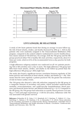 181A study of 201 heart patients found that during an average 5.4-year follow-up, the risk of heart attacks, strokes, and deaths decreased by 48% (p = .025) in the patients who were randomly assigned to the Transcendental Meditation (TM) program, compared to the control subjects randomized to receive health-education classes instead of TM (left bar). On average, both the TM group and the HE groups practiced either TM or healthy life-style activities, respectively, about 8.5 times per week, which is 61% of the recommended twice-a-day practice for both programs.A high-adherence subgroup analysis was conducted on all 141 patients practicing TM or HE activities once a day or more. The high-adherence TM group had 66% fewer heart attacks, strokes, and deaths in the follow-up period than the high-adherence HE group (p=.003) (right bar).The study also found a signifi cant inverse correlation between regularity of TM home practice and reduction in heart attacks, strokes, and deaths (p = .04). This means that the more regularly a patient practiced TM, the greater the reduction of risk for future cardiac events.The TM group also showed a 24% risk reduction compared to the HE group in a composite measure of secondary end points, which included cardiovascular mortality, revascularizations, and cardiovascular hospitalizations; blood pressure; psychosocial stress factors; and lifestyle behaviors (p = 0.17). Compared to the HE group, the TM groups had reductions in systolic blood pressure (4.9 mm Hg; p = 0.01) and anger expression (p < 0.05 for all scales). Adherence with TM was associated with greater survival.Decreased Heart Attacks, Strokes, and Death0%-10%-20%-30%-40%-50%-60%-70%%u221248%%u221266%Regular TMvs. Regular HEAssigned to TMvs. Assigned to HEp < .003p < .025tm-026LIVE LONGER, BE HEALTHIERReference: Schneider, R. H., Grim, C. E., Rainforth, M. V., Kotchen, T., Nidich, S. I., Gaylord-King, C., Salerno, J. W., Kotchen, J. M., & Alexander, C. N. (2012). Stress reduction in the secondary prevention of cardiovascular disease: Randomized, controlled trial of Transcendental Meditation and health education in Blacks. Circulation: Cardiovascular Quality and Outcomes, 5(6), 750%u2013758.