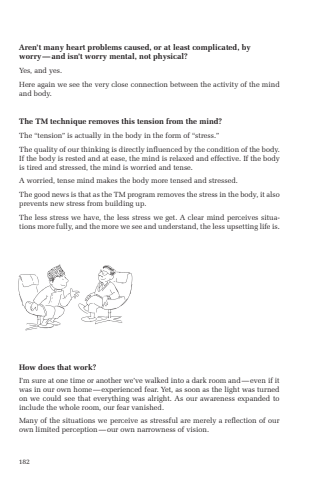 182Aren%u2019t many heart problems caused, or at least complicated, by worry%u2014and isn%u2019t worry mental, not physical?Yes, and yes. Here again we see the very close connection between the activity of the mind and body. The TM technique removes this tension from the mind?The %u201ctension%u201d is actually in the body in the form of %u201cstress.%u201d The quality of our thinking is directly influenced by the condition of the body. If the body is rested and at ease, the mind is relaxed and effective. If the body is tired and stressed, the mind is worried and tense.A worried, tense mind makes the body more tensed and stressed.The good news is that as the TM program removes the stress in the body, it also prevents new stress from building up. The less stress we have, the less stress we get. A clear mind perceives situations more fully, and the more we see and understand, the less upsetting life is.How does that work?I%u2019m sure at one time or another we%u2019ve walked into a dark room and%u2014even if it was in our own home%u2014experienced fear. Yet, as soon as the light was turned on we could see that everything was alright. As our awareness expanded to include the whole room, our fear vanished.Many of the situations we perceive as stressful are merely a reflection of our own limited perception%u2014our own narrowness of vision.