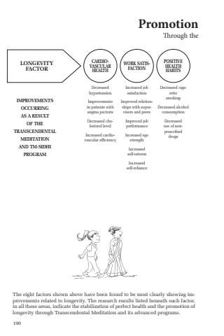 190Promotionfi rough the The eight factors shown above have been found to be most clearly showing improvements related to longevity. The research results listed beneath each factor, in all these areas, indicate the stabilization of perfect health and the promotion of longevity through Transcendental Meditation and its advanced programs.Decreased hypertensionImprovements in patients with angina pectorisDecreased cholesterol levelIncreased cardiovascular effi ciencyIncreased job satisfactionImproved relationships with supervisors and peersImproved job performanceIncreased ego strengthIncreasedself-esteemIncreasedself-relianceDecreased cigarettesmokingDecreased alcohol consumptionDecreaseduse of nonprescribed drugsLONGEVITYFACTORIMPROVEMENTSOCCURRINGAS A RESULTOF THETRANSCENDENTALMEDITATIONAND TM-SIDHIPROGRAMPOSITIVEHEALTHHABITSWORK SATISFACTIONCARDIOVASCULARHEALTH