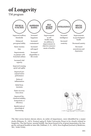 191of LongevityTM programThe fi rst seven factors shown above, in order of importance, were identifi ed by a major study (Palmore, E., 1974, Normal aging II, Duke University Press) to be closely related to longevity. The last factor, mental health, has been found to be of great importance for longevity and good health in later life (Valliant, G. E., 1979, New England Journal of Medicine, 301, 1249%u20131254).Improvements in psychological healthDecreased anxietyDecreased neuroticism and depressionImproved auditory thresholdsEnhanced perceptual abilityFaster reaction timeImprovements in patients with bronchial asthmaIncreased vital capacityImproved running speed and agilityImproved perceptual-motor performanceReduced infl ammationRelief from insomniaFaster recovery from stressImproved biochemical stability, homeostasis, & effi ciencyRestful style of physiological functioningIncreased happinessIncreased contentmentIncreasedself-regardIncreased adaptability to life eventsImprovementsin selfhealth rating (in addition to improvements in objective measurements of health)Increased intelligenceIncreased creativityMENTALHEALTHSELFHEALTHRATINGHAPPINESSRATINGPHYSICALFUNCTION INTELLIGENCE