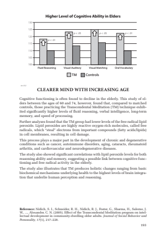 193Cognitive functioning is often found to decline in the elderly. This study of elders between the ages of 60 and 74, however, found that, compared to matched controls, those practicing the Transcendental Meditation (TM) technique exhibited signifi cantly higher levels of fl uid reasoning, verbal intelligence, long-term memory, and speed of processing.Further analyses found that the TM group had lower levels of the free radical lipid peroxide. Lipid peroxides are highly reactive oxygen-rich molecules, called free radicals, which %u201csteal%u201d electrons from important compounds (fatty acids/lipids) in cell membranes, resulting in cell damage. This process plays a major part in the development of chronic and degenerative conditions such as cancer, autoimmune disorders, aging, cataracts, rheumatoid arthritis, and cardiovascular and neurodegenerative diseases. The study also showed signifi cant correlations with lipid peroxide levels for both reasoning ability and memory, suggesting a possible link between cognitive functioning and free radical activity in the elderly. The study also illustrates that TM produces holistic changes ranging from basic biochemical mechanisms underlying health to the highest levels of brain integration that underlie human perception and reasoning.Higher Level of Cognitive Ability in Elders130125120115110105100Fluid Reasoning Visual-Auditory Visual Matching Oral VocabularyTM Controlsp < .01p < .01p < .05 p < .05tm-032CLEARER MIND WITH INCREASING AGEReference: Nidich, S. I., Schneider, R. H., Nidich, R. J., Foster, G., Sharma, H., Salerno, J. W., ..., Alexander, C. N. (2005). Effect of the Transcendental Meditation program on intellectual development in community-dwelling older adults. Journal of Social Behavior and Personality, 17(1), 217%u2013228.