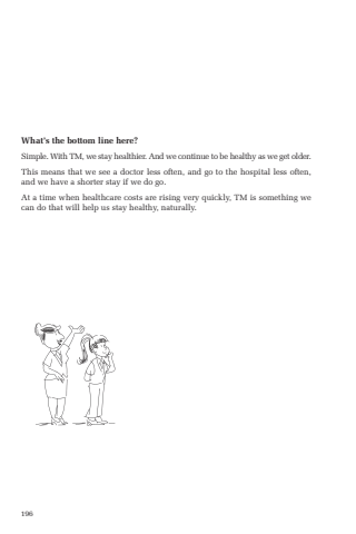 196What%u2019s the bottom line here?Simple. With TM, we stay healthier. And we continue to be healthy as we get older. This means that we see a doctor less often, and go to the hospital less often, and we have a shorter stay if we do go. At a time when healthcare costs are rising very quickly, TM is something we can do that will help us stay healthy, naturally.