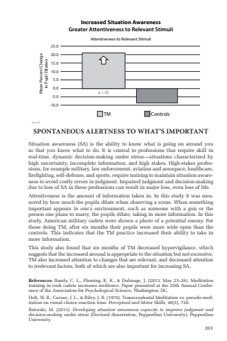 203Situation awareness (SA) is the ability to know what is going on around you so that you know what to do. It is central to professions that require skill in real-time, dynamic decision-making under stress %u2014 situations characterized by high uncertainty, incomplete information, and high stakes. High-stakes professions, for example military, law enforcement, aviation and aerospace, healthcare, fi refi ghting, self-defense, and sports, require training to maintain situation awareness to avoid costly errors in judgment. Impaired judgment and decision-making due to loss of SA in these professions can result in major loss, even loss of life.Attentiveness is the amount of information taken in. In this study it was measured by how much the pupils dilate when observing a scene. When something important appears in one%u2019s environment, such as someone with a gun or the person one plans to marry, the pupils dilate, taking in more information. In this study, American military cadets were shown a photo of a potential enemy. For those doing TM, after six months their pupils were more wide open than the controls. This indicates that the TM practice increased their ability to take in more information. This study also found that six months of TM decreased hypervigilance, which suggests that the increased arousal is appropriate to the situation but not excessive. TM also increased attention to changes that are relevant, and decreased attention to irrelevant factors, both of which are also important for increasing SA.Increased Situation AwarenessGreater Attentiveness to Relevant StimuliAttentiveness to Relevant StimuliMean Percent Change in Pupil Dilation25.020.015.010.05.00.0-5.0-10.0TM Controlstm-019p < .05SPONTANEOUS ALERTNESS TO WHAT%u2019S IMPORTANTReferences: Bandy, C. L., Fleming, K. K., & Dulmage, J. (2013, May 23%u201326). Meditation training in rook cadets increases resilience. Paper presented at the 25th Annual Conference of the Association for Psychological Science, Washington, DC.Holt, W. R., Caruso, J. L., & Riley, J. B. (1978). Transcendental Meditation vs. pseudo-meditation on visual choice reaction time. Perceptual and Motor Skills, 46(3), 726.Batorski, M. (2011). Developing situation awareness capacity to improve judgment and decision-making under stress (Doctoral dissertation, Pepperdine University). Pepperdine University.