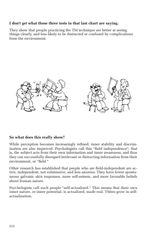 212I don%u2019t get what those three tests in that last chart are saying.They show that people practicing the TM technique are better at seeing things clearly, and less likely to be distracted or confused by complications from the environment.So what does this really show?While perception becomes increasingly refined, inner stability and discrimination are also improved. Psychologists call this %u201cfield independence%u201d; that is, the subject acts from their own information and inner awareness, and thus they can successfully disregard irrelevant or distracting information from their environment, or %u201cfield.%u201dOther research has established that people who are field-independent are active, independent, not submissive, and less anxious. They have fewer spontaneous galvanic skin responses, more self-esteem, and more favorable beliefs about human nature.Psychologists call such people %u201cself-actualized.%u201d This means that their own inner nature, or inner potential, is actualized, made real. TMers grow in selfactualization.