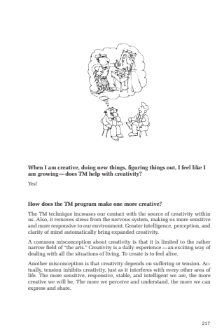 217When I am creative, doing new things, figuring things out, I feel like I am growing%u2014does TM help with creativity?Yes!How does the TM program make one more creative?The TM technique increases our contact with the source of creativity within us. Also, it removes stress from the nervous system, making us more sensitive and more responsive to our environment. Greater intelligence, perception, and clarity of mind automatically bring expanded creativity.A common misconception about creativity is that it is limited to the rather narrow field of %u201cthe arts.%u201d Creativity is a daily experience%u2014an exciting way of dealing with all the situations of living. To create is to feel alive.Another misconception is that creativity depends on suffering or tension. Actually, tension inhibits creativity, just as it interferes with every other area of life. The more sensitive, responsive, stable, and intelligent we are, the more creative we will be. The more we perceive and understand, the more we can express and share.