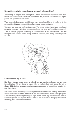 220Does this creativity extend to my personal relationships?Absolutely. It begins with perception. When our nervous system is free from stress and our mind is clear and expanded, we perceive the world as a joyful place. We appreciate life more.This appreciation grows until it can only be referred to as love. Love is the automatic, ultimate appreciation of a person, place, or thing.We send out love; we get love in return. %u201cFor every action there is an equal and opposite reaction.%u201d We love, we receive love. We hate, and find hate returned. This is simple physics. Nothing in the universe exists in isolation. All our thoughts and actions affect every atom in creation, and every atom responds in kind.So we should try to love.No. There should be no trying involved. Loving is natural. People are not born for suffering. We are born to enjoy life, to radiate this enjoyment for all to share. This is the natural, spontaneous experience of evolution: greater joy and happiness.It is this natural tendency to radiate goodness when we are feeling happy that is the basis of the social benefits of the Transcendental Meditation program. Like electricity running through a light bulb, when joy enlivens the human nervous system, the system has no choice but to express this joy, this understanding, this appreciation of life.