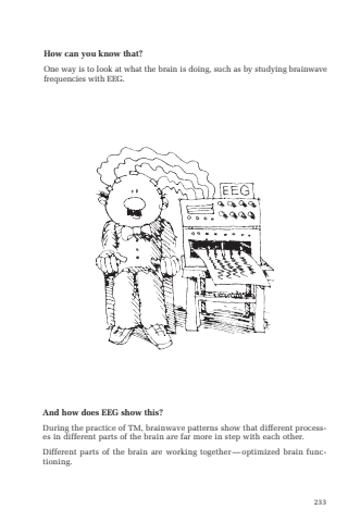 233And how does EEG show this?During the practice of TM, brainwave patterns show that different processes in different parts of the brain are far more in step with each other. Different parts of the brain are working together %u2014optimized brain functioning.How can you know that?One way is to look at what the brain is doing, such as by studying brainwave frequencies with EEG.