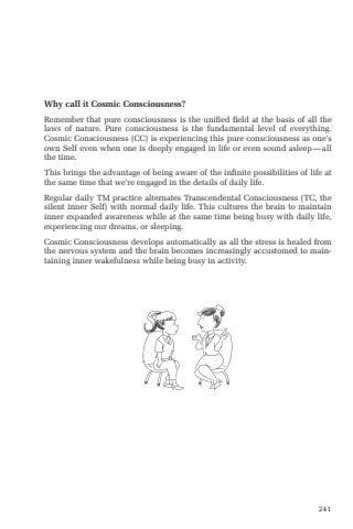 241Why call it Cosmic Consciousness?Remember that pure consciousness is the unified field at the basis of all the laws of nature. Pure consciousness is the fundamental level of everything. Cosmic Consciousness (CC) is experiencing this pure consciousness as one%u2019s own Self even when one is deeply engaged in life or even sound asleep%u2014all the time. This brings the advantage of being aware of the infinite possibilities of life at the same time that we%u2019re engaged in the details of daily life.Regular daily TM practice alternates Transcendental Consciousness (TC, the silent inner Self) with normal daily life. This cultures the brain to maintain inner expanded awareness while at the same time being busy with daily life, experiencing our dreams, or sleeping. Cosmic Consciousness develops automatically as all the stress is healed from the nervous system and the brain becomes increasingly accustomed to maintaining inner wakefulness while being busy in activity.