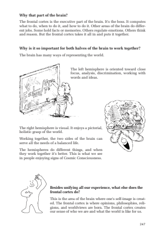 247Why that part of the brain?The frontal cortex is the executive part of the brain. It%u2019s the boss. It computes what to do, when to do it, and how to do it. Other areas of the brain do different jobs. Some hold facts or memories. Others regulate emotions. Others think and reason. But the frontal cortex takes it all in and puts it together. Why is it so important for both halves of the brain to work together?The brain has many ways of representing the world. The left hemisphere is oriented toward close focus, analysis, discrimination, working with words and ideas.The right hemisphere is visual. It enjoys a pictorial, holistic grasp of the world. Working together, the two sides of the brain can serve all the needs of a balanced life.The hemispheres do different things, and when they work together it%u2019s better. This is what we see in people enjoying signs of Cosmic Consciousness.Besides unifying all our experience, what else does the frontal cortex do?This is the area of the brain where one%u2019s self-image is created. The frontal cortex is where opinions, philosophies, religions, and worldviews are born. The frontal cortex creates our sense of who we are and what the world is like for us.