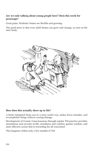 252Are we only talking about young people here? Does this work for grownups?Good point. Students%u2019 brains are fl exible and growing. The good news is that even adult brains can grow and change, as seen in the next study.How does this actually show up in life?A better integrated brain acts in a more useful way, makes fewer mistakes, and accomplishes things without causing damage.Development of Cosmic Consciousness through regular TM practice provides smoothness and security in life, steadiness and comfort, greater wisdom, and more effective action that is rewarding for all concerned.This happens within only a few months of TM.
