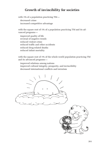 261Growth of invincibility for societieswith 1% of a population practicing TM%u2014decreased crimeincreased competitive advantagewith the square root of 1% of a population practicing TM and its advanced programs%u2014improved quality of life reversal of negative trends reduced violent crime reduced traffic and other accidents reduced drug-related deaths reduced infant mortality with the square root of 1% of the whole world population practicing TM and its advanced programs%u2014improved relations among nationsimproved cultural integrity, prosperity, and invincibilitydecreased international conflicts and terrorism