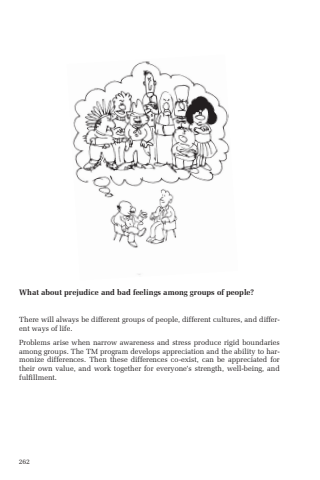 262What about prejudice and bad feelings among groups of people?There will always be different groups of people, different cultures, and different ways of life.Problems arise when narrow awareness and stress produce rigid boundaries among groups. The TM program develops appreciation and the ability to harmonize differences. Then these differences co-exist, can be appreciated for their own value, and work together for everyone%u2019s strength, well-being, and fulfillment.
