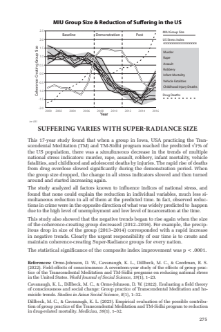 275This 17-year study found that when a group in Iowa, USA practicing the Transcendental Meditation (TM) and TM-Sidhi program reached the predicted %u221a1% of the US population, there was a simultaneous decrease in the trends of multiple national stress indicators: murder, rape, assault, robbery, infant mortality, vehicle fatalities, and childhood and adolescent deaths by injuries. The rapid rise of deaths from drug overdose slowed signifi cantly during the demonstration period. When the group size dropped, the change in all stress indicators slowed and then turned around and started increasing again.The study analyzed all factors known to infl uence indices of national stress, and found that none could explain the reduction in individual variables, much less simultaneous reduction in all of them at the predicted time. In fact, observed reductions in crime were in the opposite direction of what was widely predicted to happen due to the high level of unemployment and low level of incarceration at the time. This study also showed that the negative trends began to rise again when the size of the coherence-creating group decreased (2012%u20132016). For example, the precipitous drop in size of the group (2013%u20132014) corresponded with a rapid increase in negative trends. Clearly the urgent responsibility of our time is to create and maintain coherence-creating Super-Radiance groups for every nation.The statistical signifi cance of the composite index improvement was p < .0001.2.52.01.51.00.50.0-0.5-1.0-1.5-2.0Coherence-Creating Group SizeBaseline Demonstration PostMIU Group Size & Reduction of Sufiering in the USYear2000 2002 2004 2006 2008 2010 2012 2014 2016MIU Group SizeUS Stress IndexDrug DeathsMurderRapeAssaultRobberyInfant MortalityVehicle FatalitiesChildhood Injury Deathstm-085SUFFERING VARIES WITH SUPER-RADIANCE SIZEReferences: Orme-Johnson, D. W., Cavanaugh, K. L., Dillbeck, M. C., & Goodman, R. S. (2022). Field-effects of consciousness: A seventeen-year study of the effects of group practice of the Transcendental Meditation and TM-Sidhi programs on reducing national stress in the United States. World Journal of Social Science, 19(1), 1%u201323.Cavanaugh, K. L., Dillbeck, M. C., & Orme-Johnson, D. W. (2022). Evaluating a fi eld theory of consciousness and social change: Group practice of Transcendental Meditation and homicide trends. Studies in Asian Social Science, 8(1), 1%u201332.Dillbeck, M. C., & Cavanaugh, K. L. (2023). Empirical evaluation of the possible contribution of group practice of the Transcendental Meditation and TM-Sidhi program to reduction in drug-related mortality. Medicina, 59(1), 1%u201332.