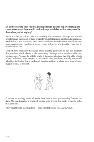 276Consider an analogy%u2014we all know how hard it is to get anything done in the dark. We can imagine a group of people who live in the dark, trying to solve that problem.They might form a committee%u2014THE COMMITTEE ON DARKNESS.So you%u2019re saying that just by getting enough people experiencing pure consciousness%u2014that would make things much better for everyone? Is that what you%u2019re saying?Yes it is%u2014but let%u2019s think about it carefully for a moment. Perhaps the world%u2019s problems are the result of lack of creativity, intelligence, and broad awareness. And if this is the situation, then these problems would fade as we all become more creative and intelligent, more connected to the whole rather than lost in the details of life. Look at how humanity has gone about solving problems so far. We examine the problem, think about it, do something. Perhaps what we do is effective, perhaps not. Perhaps in a little while it becomes obvious that the side effects of our %u201csolution%u201d have created a cascade of new problems. Clearly, our world situation indicates that a profound transformation, a whole new way of solving problems, is needed.