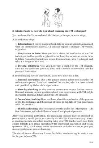 283If I decide to do it, how do I go about learning the TM technique?You can learn the Transcendental Meditation technique in seven steps:A. Introductory steps:1. Introduction: If you%u2019ve read our book this far you are already acquainted with the introductory material. Or you can explore TM.org or TM-Women.org online.2. Preparation to learn: Here you learn about the mechanics of the TM technique itself%u2014specific explanations of how the technique works, how it differs from other techniques, where it comes from, how it is taught, and why it is taught in that way.3. Personal intervie Next, you meet with a teacher of the TM program, clear up any questions you may have, and schedule a convenient time for personal instruction.B. Four following days of instruction, about two hours each day. 4. Personal instruction: This is the private session where you learn the TM technique in person from your certified TM teacher, who has been trained and qualified by Maharishi%u2019s organization.5. First day checking: In this seminar session you receive further instruction and answers to your questions about your experiences with TM, while discussing practical details about the TM program.6. Second day checking: Here you learn about the mechanics of the process of the TM technique and the release of stress in the light of your experience with the practice.7. Third day checking: This session explores the goal of the TM program%u2014life free from stress, with the full use of mental and physical potential.After your personal instruction, the remaining sessions may be attended in person with a small group, or virtually via the TM Community app. Virtual sessions include an online meeting with your TM teacher each day. Both course formats give ample opportunity for individual instruction and to ask questions. Plus, you%u2019ll enjoy bonus meditations with the teacher, to give you more experience as you are learning. The virtual format allows much more flexibility in scheduling, to make it easier for you to learn TM.