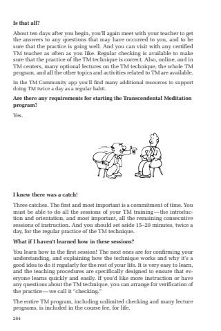284Is that all?About ten days after you begin, you%u2019ll again meet with your teacher to get the answers to any questions that may have occurred to you, and to be sure that the practice is going well. And you can visit with any certified TM teacher as often as you like. Regular checking is available to make sure that the practice of the TM technique is correct. Also, online, and in TM centers, many optional lectures on the TM technique, the whole TM program, and all the other topics and activities related to TM are available.In the TM Community app you%u2019ll find many additional resources to support doing TM twice a day as a regular habit.Are there any requirements for starting the Transcendental Meditation program?Yes.I knew there was a catch!Three catches. The first and most important is a commitment of time. You must be able to do all the sessions of your TM training%u2014the introduction and orientation, and most important, all the remaining consecutive sessions of instruction. And you should set aside 15%u201320 minutes, twice a day, for the regular practice of the TM technique.What if I haven%u2019t learned how in these sessions?You learn how in the first session! The next ones are for confirming your understanding, and explaining how the technique works and why it%u2019s a good idea to do it regularly for the rest of your life. It is very easy to learn, and the teaching procedures are specifically designed to ensure that everyone learns quickly and easily. If you%u2019d like more instruction or have any questions about the TM technique, you can arrange for verification of the practice%u2014we call it %u201cchecking.%u201d The entire TM program, including unlimited checking and many lecture programs, is included in the course fee, for life.