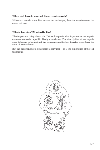 287When do I have to meet all these requirements?When you decide you%u2019d like to start the technique, then the requirements become relevant.What%u2019s learning TM actually like?The important thing about the TM technique is that it produces an experience%u2014a concrete, specific, lively experience. The description of an experience is bound to be abstract. As we mentioned before, imagine describing the taste of a strawberry. But the experience of a strawberry is very real%u2014as is the experience of the TM technique.