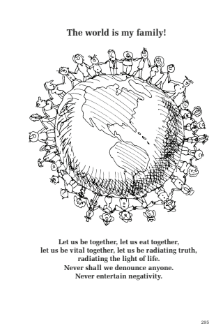 295The world is my family!Let us be together, let us eat together, let us be vital together, let us be radiating truth, radiating the light of life. Never shall we denounce anyone. Never entertain negativity.