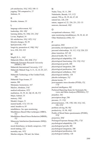 299job satisfaction, 101f, 107f, 108%u201311jogging, TM compared to, 27Judaism, 34KKouider, Atmane, 33Llanguage achievement, 91fleadership, 104, 105flearning ability, 92, 189f, 235, 235fLevine, Raphael, 34life satisfaction, 101f, 107f, 111flifestyle changes, 58, 59lipid peroxide, 193flongevity, promotion of, 190f, 191flove, 220, 222, 223MMagill, D. L., 161fMaharishi Effect, 268, 269f, 271fMaharishi European Research University (MERU), 160Maharishi International University, 117fMaharishi Mahesh Yogi, 9, 31, 32, 43, 85, 227, 290Maharishi Technology of the Unified Field, 186Maharishi Yoga Asanas, 37mantra, 288Marijuana Anonymous, 167Maslow, Abraham, 219fmedical utilization, 197fmeditation, 24, 39, 42, 44f, 45, 48, 57fMej%u00eda, Gabriel, 35memory, 189fMendel, Gregor, 31mental health, 117f, 153%u201354mind, benefits to, 85mindfulness. See open monitoringMindfulness-Based Other techniques (MBO), 57fMindfulness-Based Stress Reduction (MBSR), 57fMinnesota Satisfaction Questionnaire (MSQ), 113fmood disturbance, in family caregivers, 135fmood making, 222mortality rate, 197fMuslim religion, TM and, See IslamNNader, Tony, 10, 11, 290Nakalembe, Brenda, 115, 117fnatural, TM as, 28, 29, 66, 67, 68natural law, 228, 230nature, support of, 22, 230, 231, 232%u201333neurosis, decreased, 103fOoccupational coherence, 101fopen monitoring (mindfulness), 38, 39, 42, 45Other Meditations (OM), 57fPperception, 205fpersonality, development of, 224personal relationships, 18, 112, 113f, 220, 223phase transition, 267%u201368physical health, 95f, 117fphysiological adaptability, 138physiological functioning, 134, 135f, 151fphysiological growth, 208physiological integration, 200physiological purification, 146physiological settledness, 101fphysiological stability, 128placebo techniques, 51fplasma lactate, 77post-traumatic stress disorder (PTSD), 57f, 173fpractical intelligence, 89fPreferred Reporting Items for Systematic Reviews and Meta-Analyses (PRISMA), 57fprejudice, 262prescription drugs, 286pressure, 15, 133fprison/prisoners, 158, 159f, 160, 161f, 162, 166, 225fproblem solving, 88, 95fproductivity, 19, 98, 105fProfile of Mood States questionnaire (POMS), 253fprojection, 205fProlonged Exposure therapy (PE), 173fpsychological adaptability, 138psychological growth, 208psychological integration, 200psychological purification, 146psychological stability, 128