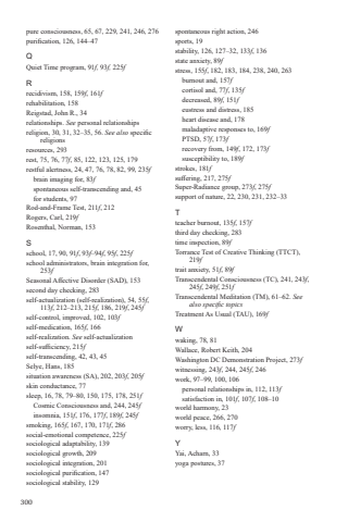 300pure consciousness, 65, 67, 229, 241, 246, 276purification, 126, 144%u201347QQuiet Time program, 91f, 93f, 225fRrecidivism, 158, 159f, 161frehabilitation, 158Reigstad, John R., 34relationships. See personal relationshipsreligion, 30, 31, 32%u201335, 56. See also specific religionsresources, 293rest, 75, 76, 77f, 85, 122, 123, 125, 179restful alertness, 24, 47, 76, 78, 82, 99, 235fbrain imaging for, 83fspontaneous self-transcending and, 45for students, 97Rod-and-Frame Test, 211f, 212Rogers, Carl, 219fRosenthal, Norman, 153Sschool, 17, 90, 91f, 93f%u201394f, 95f, 225fschool administrators, brain integration for, 253fSeasonal Affective Disorder (SAD), 153second day checking, 283self-actualization (self-realization), 54, 55f, 113f, 212%u2013213, 215f, 186, 219f, 245fself-control, improved, 102, 103fself-medication, 165f, 166self-realization. See self-actualizationself-sufficiency, 215fself-transcending, 42, 43, 45Selye, Hans, 185situation awareness (SA), 202, 203f, 205fskin conductance, 77sleep, 16, 78, 79%u201380, 150, 175, 178, 251fCosmic Consciousness and, 244, 245finsomnia, 151f, 176, 177f, 189f, 245fsmoking, 165f, 167, 170, 171f, 286social-emotional competence, 225fsociological adaptability, 139sociological growth, 209sociological integration, 201sociological purification, 147sociological stability, 129spontaneous right action, 246sports, 19stability, 126, 127%u201332, 133f, 136state anxiety, 89fstress, 155f, 182, 183, 184, 238, 240, 263burnout and, 157fcortisol and, 77f, 135fdecreased, 89f, 151feustress and distress, 185heart disease and, 178maladaptive responses to, 169fPTSD, 57f, 173frecovery from, 149f, 172, 173fsusceptibility to, 189fstrokes, 181fsuffering, 217, 275fSuper-Radiance group, 273f, 275fsupport of nature, 22, 230, 231, 232%u201333Tteacher burnout, 135f, 157fthird day checking, 283time inspection, 89fTorrance Test of Creative Thinking (TTCT), 219ftrait anxiety, 51f, 89fTranscendental Consciousness (TC), 241, 243f, 245f, 249f, 251fTranscendental Meditation (TM), 61%u201362. See also specific topicsTreatment As Usual (TAU), 169fWwaking, 78, 81Wallace, Robert Keith, 204Washington DC Demonstration Project, 273fwitnessing, 243f, 244, 245f, 246work, 97%u201399, 100, 106personal relationships in, 112, 113fsatisfaction in, 101f, 107f, 108%u201310world harmony, 23world peace, 266, 270worry, less, 116, 117fYYai, Acharn, 33yoga postures, 37