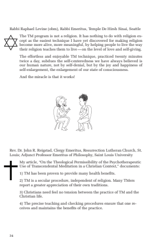 34Rabbi Raphael Levine (obm), Rabbi Emeritus, Temple De Hirsh Sinai, SeattleThe TM program is not a religion. It has nothing to do with religion except as the easiest technique I have yet discovered for making religion become more alive, more meaningful, by helping people to live the way their religion teaches them to live%u2014on the level of love and self-giving.The effortless and enjoyable TM technique, practiced twenty minutes twice a day, subdues the self-centeredness we have always believed is our human nature, not by self-denial, but by the joy and happiness of self-enlargement, the enlargement of our state of consciousness. And the miracle is that it works!Rev. Dr. John R. Reigstad, Clergy Emeritus, Resurrection Lutheran Church, St. Louis; Adjunct Professor Emeritus of Philosophy, Saint Louis UniversityMy article, %u201cOn the Theological Permissibility of the Psychotherapeutic Use of Transcendental Meditation in a Christian Context,%u201d documents: 1) TM has been proven to provide many health benefits. 2) TM is a secular procedure, independent of religion. Many TMers report a greater appreciation of their own traditions. 3) Christians need feel no tension between the practice of TM and the Christian life. 4) The precise teaching and checking procedures ensure that one receives and maintains the benefits of the practice.