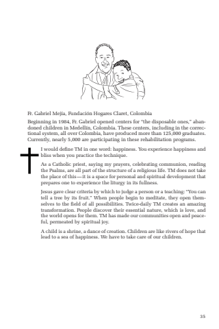 35Fr. Gabriel Mej%u00eda, Fundaci%u00f3n Hogares Claret, ColombiaBeginning in 1984, Fr. Gabriel opened centers for %u201cthe disposable ones,%u201d abandoned children in Medell%u00edn, Colombia. These centers, including in the correctional system, all over Colombia, have produced more than 125,000 graduates. Currently, nearly 5,000 are participating in these rehabilitation programs. I would define TM in one word: happiness. You experience happiness and bliss when you practice the technique.As a Catholic priest, saying my prayers, celebrating communion, reading the Psalms, are all part of the structure of a religious life. TM does not take the place of this%u2014it is a space for personal and spiritual development that prepares one to experience the liturgy in its fullness.Jesus gave clear criteria by which to judge a person or a teaching: %u201cYou can tell a tree by its fruit.%u201d When people begin to meditate, they open themselves to the field of all possibilities. Twice-daily TM creates an amazing transformation. People discover their essential nature, which is love, and the world opens for them. TM has made our communities open and peaceful, permeated by spiritual joy. A child is a shrine, a dance of creation. Children are like rivers of hope that lead to a sea of happiness. We have to take care of our children.