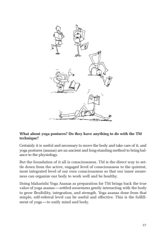 37What about yoga postures? Do they have anything to do with the TM technique?Certainly it is useful and necessary to move the body and take care of it, and yoga postures (asanas) are an ancient and long-standing method to bring balance to the physiology. But the foundation of it all is consciousness. TM is the direct way to settle down from the active, engaged level of consciousness to the quietest, most integrated level of our own consciousness so that our inner awareness can organize our body to work well and be healthy. Doing Maharishi Yoga Asanas as preparation for TM brings back the true value of yoga asanas%u2014settled awareness gently interacting with the body to grow flexibility, integration, and strength. Yoga asanas done from that simple, self-referral level can be useful and effective. This is the fulfillment of yoga%u2014to unify mind and body.