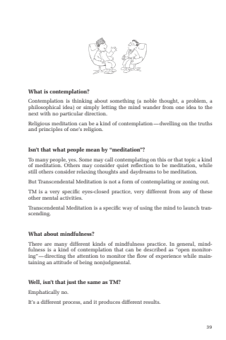 39What is contemplation?Contemplation is thinking about something (a noble thought, a problem, a philosophical idea) or simply letting the mind wander from one idea to the next with no particular direction.Religious meditation can be a kind of contemplation%u2014dwelling on the truths and principles of one%u2019s religion.Isn%u2019t that what people mean by %u201cmeditation%u201d?To many people, yes. Some may call contemplating on this or that topic a kind of meditation. Others may consider quiet reflection to be meditation, while still others consider relaxing thoughts and daydreams to be meditation.But Transcendental Meditation is not a form of contemplating or zoning out. TM is a very specific eyes-closed practice, very different from any of these other mental activities.Transcendental Meditation is a specific way of using the mind to launch transcending.What about mindfulness?There are many different kinds of mindfulness practice. In general, mindfulness is a kind of contemplation that can be described as %u201copen monitoring%u201d%u2014directing the attention to monitor the flow of experience while maintaining an attitude of being nonjudgmental.Well, isn%u2019t that just the same as TM?Emphatically no. It%u2019s a different process, and it produces different results.