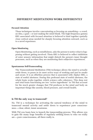 45Focused AttentionThese techniques involve concentrating or focusing on something %u2014 a word, an idea, a goal %u2014 or just making the mind blank. The high-frequency gamma EEG associated with focused attention is believed to bind together spatially close cortical areas needed for sharply focusing attention outward, such as to a novel experience.Open MonitoringOpen Monitoring, such as mindfulness, asks the person to notice what is happening without getting involved. Theta EEG is believed to refl ect inhibition of outer sensory information that might disturb the person%u2019s inner thought processes, such as when they are monitoring their subjective experiences.Spontaneous Self-TranscendingThe Transcendental Meditation (TM) technique allows the mind to actually settle down, to pause in its more active ways of working and just be awake and aware. It is an effortless process that is associated with Alpha1 EEG, a state of restful alertness. During this profound state of restful alertness, the whole brain works together, which science calls coherence. This deep rest and total brain functioning are two %u201cactive ingredients%u201d in TM that account for the much greater changes that TM produces in the mind and body on important things like anxiety, blood pressure, and overall health.DIFFERENT MEDITATIONS WORK DIFFERENTLYIs TM the only way to transcend?No. TM is a technique for activating the natural tendency of the mind to transcend mental activity and settle down to experience pure consciousness %u2014 clear, silent, inner awareness.With TM you learn how to launch the transcending process. This allows you to gain the many huge benefi ts of regularly settling down to who we really are %u2014 pure consciousness, all there really is.