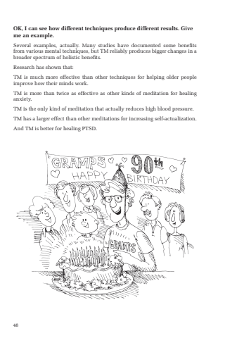 48OK, I can see how different techniques produce different results. Give me an example.Several examples, actually. Many studies have documented some benefits from various mental techniques, but TM reliably produces bigger changes in a broader spectrum of holistic benefits.Research has shown that: TM is much more effective than other techniques for helping older people improve how their minds work.TM is more than twice as effective as other kinds of meditation for healing anxiety. TM is the only kind of meditation that actually reduces high blood pressure. TM has a larger effect than other meditations for increasing self-actualization. And TM is better for healing PTSD.