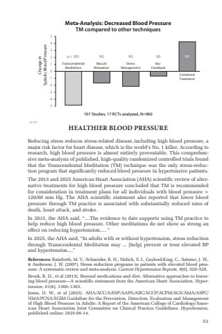 53Reducing stress reduces stress-related disease, including high blood pressure, a major risk factor for heart disease, which is the world%u2019s No. 1 killer. According to research, high blood pressure is almost entirely preventable. This comprehensive meta-analysis of published, high-quality randomized controlled trials found that the Transcendental Meditation (TM) technique was the only stress-reduction program that signifi cantly reduced blood pressure in hypertensive patients.The 2013 and 2025 American Heart Association (AHA) scientifi c review of alternative treatments for high blood pressure concluded that TM is recommended for consideration in treatment plans for all individuals with blood pressure > 120/80 mm Hg. The AHA scientifi c statement also reported that lower blood pressure through TM practice is associated with substantially reduced rates of death, heart attack, and stroke.In 2013, the AHA said, %u201c%u2026The evidence to date supports using TM practice to help reduce high blood pressure. Other meditations do not show as strong an effect on reducing hypertension%u2026. %u201d In 2025, the AHA said, %u201cIn adults with or without hypertension, stress reduction through Transcendental Meditation may ... [help] prevent or treat elevated BP and hypertension....%u201d107 Studies, 17 RCTs analyzed, N=960Meta-Analysis: Decreased Blood PressureTM compared to other techniquesChange in Systolic Blood Pressure543210-1-2-3-4-5TranscendentalMeditationMuscleRelaxationStressManagementBioFeedbackCombinedTreatmentp < .001 NS NS NS NStm-027HEALTHIER BLOOD PRESSUREReferences: Rainforth, M. V., Schneider, R. H., Nidich, S. I., Gaylord-King, C., Salerno, J. W., & Anderson, J. W. (2007). Stress reduction programs in patients with elevated blood pressure: A systematic review and meta-analysis. Current Hypertension Reports, 9(6), 520%u2013528. Brook, R. D., et al (2013). Beyond medications and diet: Alternative approaches to lowering blood pressure%u2014A scientifi c statement from the American Heart Association. Hypertension, 61(6), 1360%u20131383. Jones, D. W., et al (2025). AHA/ACC/AANP/AAPA/ABC/ACCP/ACPM/AGS/AMA/ASPC/NMA/PCNA/SGIM Guideline for the Prevention, Detection, Evaluation and Management of High Blood Pressure in Adults: A Report of the American College of Cardiology/American Heart Association Joint Committee on Clinical Practice Guidelines. Hypertension,published online: 2025-08-14.