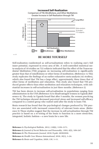 55Self-realization (understood as self-actualization) refers to realizing one%u2019s full inner potential, expressed in every area of life. A well-controlled statistical meta-analysis of 18 studies on 722 subjects indicated that the effect of the Transcendental Meditation (TM) program on increasing self-realization is signifi cantly greater than that of mindfulness or other forms of meditation. (Reference 1) This study replicates the fi ndings of an earlier exhaustive meta-analysis (42 studies), which also found that TM has a large effect, approximately three times that of other forms of meditation and relaxation. This study also found that TM produced greater effects than other meditation and relaxation techniques, with substantial increases in self-actualization in just three months. (Reference 2)TM has been shown to increase self-actualization in populations ranging from administrators in the USA (Reference 3) to disadvantaged women in Uganda (Reference 4). The study in Uganda found that after 3 months, the women practicing the TM technique showed decreased perceived stress and increased self-effi cacy compared to a control group who waited until after the study to learn TM.Brain research has found that the psychological changes produced by TM practice are associated with increased connectivity of relevant brain areas. (Reference 5) These studies suggest that the increase in self-actualization through TM practice is based on a re-wiring of the brain to function in a more stress-free, integrated, holistic fashion %u2014 a new brain for a new life.BE MORE YOURSELFIncreased Self-Realization0.900.800.700.600.500.400.300.200.100.00Efiect Size (d) (standard deviations)TM Mindfulness Other MeditationsComparison of TM, Mindfulness, and Other MeditationsGreater Increase in Self-Realization through TM0.850.430.30Self-RealizationLarge EfiectMeta-analysis: 18 studies772 subjectstm-030Reference 1: Psychological Bulletin, 2012; 138(6), 1139%u20131171. Reference 2: Journal of Social Behavior and Personality, 1991; 6(5), 189%u2013247. Reference 3: The Permanente Journal, 2018; E-pub: 10/29/2018. Reference 4: Health Care Women International, 2018; 39(1), 1%u201324. Reference 5: Brain and Cognition, 2020; 139, 1%u201311.