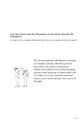 61Now that I know what the TM program is not, tell me what the TM technique is.Let%u2019s give you a complete definition first; then we can analyze it point by point.The Transcendental Meditation technique is a simple, natural, effortless process that allows the mind to experience subtler and subtler levels of the thinking process until thinking is transcended and we settle to our own quietest essential nature, pure consciousness, the source of thought.