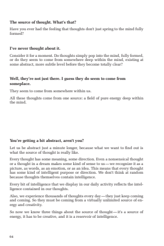 64The source of thought. What%u2019s that?Have you ever had the feeling that thoughts don%u2019t just spring to the mind fully formed?I%u2019ve never thought about it.Consider it for a moment. Do thoughts simply pop into the mind, fully formed, or do they seem to come from somewhere deep within the mind, existing at some abstract, more subtle level before they become totally clear?Well, they%u2019re not just there. I guess they do seem to come from someplace.They seem to come from somewhere within us.All these thoughts come from one source: a field of pure energy deep within the mind.You%u2019re getting a bit abstract, aren%u2019t you?Let us be abstract just a minute longer, because what we want to find out is what the source of thought is really like.Every thought has some meaning, some direction. Even a nonsensical thought or a thought in a dream makes some kind of sense to us%u2014we recognize it as a picture, as words, as an emotion, or as an idea. This means that every thought has some kind of intelligent purpose or direction. We don%u2019t think at random because thoughts themselves contain intelligence.Every bit of intelligence that we display in our daily activity reflects the intelligence contained in our thoughts.Also, we experience thousands of thoughts every day%u2014they just keep coming and coming. So they must be coming from a virtually unlimited source of energy and creativity.So now we know three things about the source of thought%u2014it%u2019s a source of energy, it has to be creative, and it is a reservoir of intelligence.