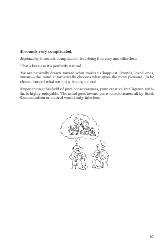 67It sounds very complicated.Explaining it sounds complicated, but doing it is easy and effortless. That%u2019s because it%u2019s perfectly natural. We are naturally drawn toward what makes us happiest. Friends, loved ones, music%u2014the mind automatically chooses what gives the most pleasure. To be drawn toward what we enjoy is very natural.Experiencing this field of pure consciousness, pure creative intelligence within, is highly enjoyable. The mind goes toward pure consciousness all by itself. Concentration or control would only interfere.